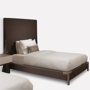 The love for details in fashion couture inspired this sleek refined bed with prolonged headboard and its oversized tailored zippers. The thinly designed frame is boosted with a headrest resembling two cushy oversized-pillows and extends to both sides to accommodate as backing and platform for the nightstands (not included) for an integrated hotel-suite look. A noble metal base surrounds the upholstery and adds a sophisticated touch for your bedroom.