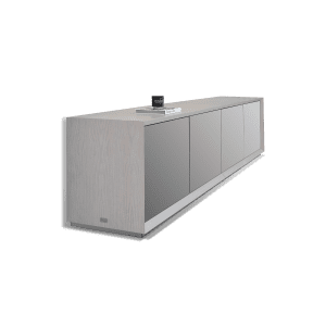 This cleanly designed buffet shines through its combination of European oak and sleek inlayed lines of noble metal. The combination of drawers and doors can be individually configured for personalized functionality.