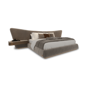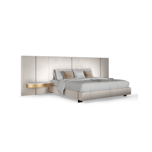 Feel like a movie star in this luxuriously upholstered bed with a oversized headboard. Its bold, self-assured personality rests on sleekly designed metal feet that go through the clean shape of the frame juxtaposing the noble metal and soft upholstery in the piece. A revealing pleat adds another element of sophistication giving testimony to the finest Italian craftsmanship that built this bed. The IMPERIAL edition features an extra wide headboard with integrated nightstands to achieve a hotel-like look & feel. The oval nightands have a unique opening mechanism with a revolveable marble top.
