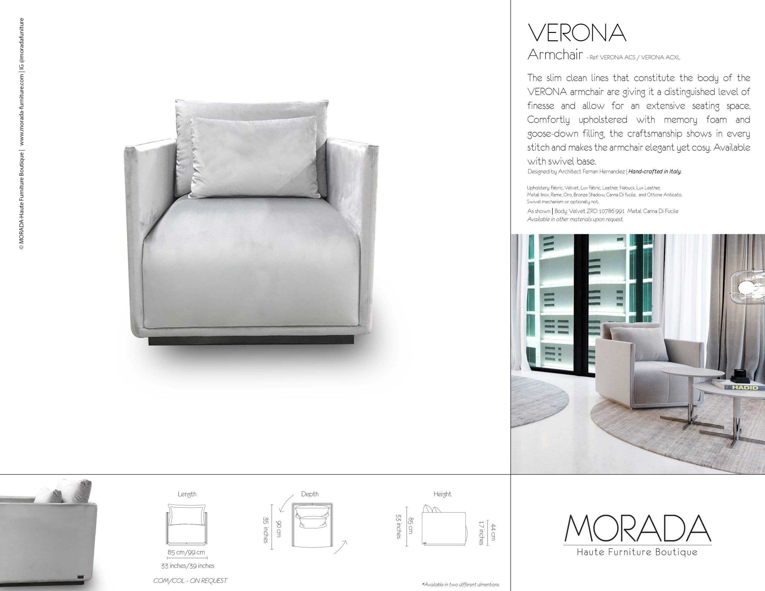 The slim clean lines that constitute the body of the VERONA armchair are giving it a distinguished level of finesse and allow for an extensive seating space. Comfortably upholstered with memory foam and goose-down filling, the craftsmanship shows in every stitch and makes the armchair elegant yet cozy. Available with swivel base.