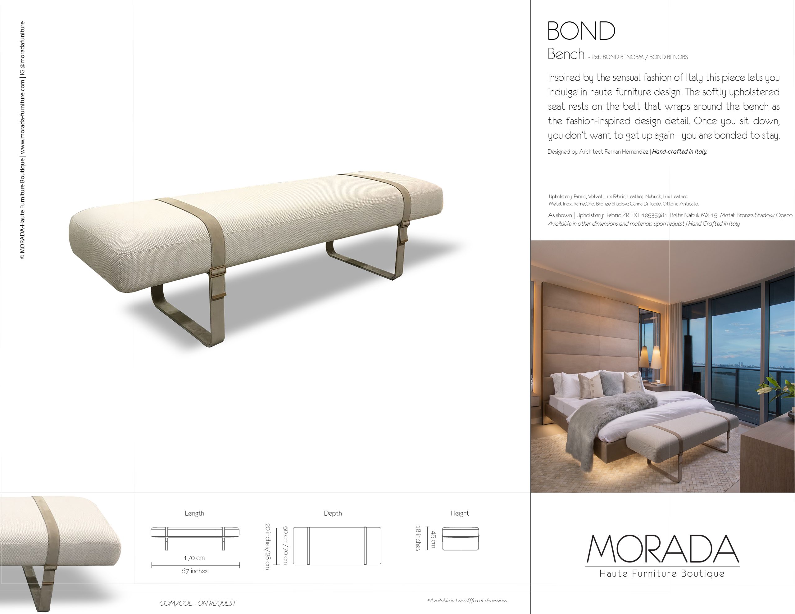 Inspired by the sensual fashion of Italy this piece lets you indulge in haute furniture design. The softly upholstered seat rests on the belt that wraps around the bench as the fashion-inspired design detail. Once you sit down, you don’t want to get up again – you are bonded to stay.