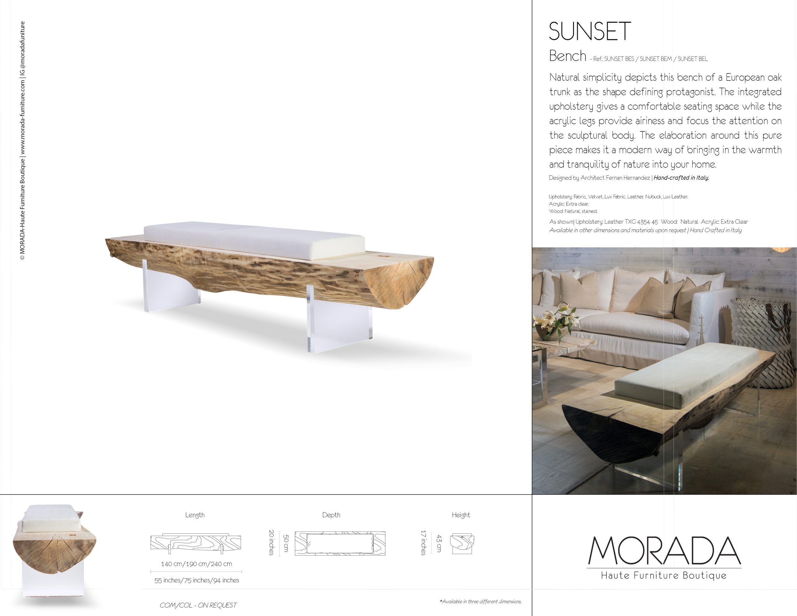 Natural simplicity depicts this bench of a European oak trunk as the shape defining protagonist. The integrated upholstery gives a comfortable seating space while the acrylic legs provide airiness and focus the attention on the sculptural body. The elaboration around this pure piece makes it a modern way of bringing in the warmth and tranquility of nature into your home.