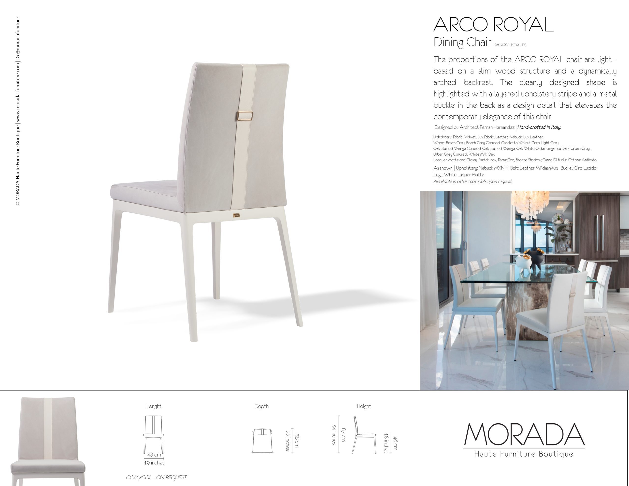 The proportions of the ARCO ROYAL chair are light – based on a slim wood structure and a dynamically arched backrest. The cleanly designed shape is highlighted with a layered upholstery stripe and a metal buckle in the back as a design detail that elevates the contemporary elegance of this chair.