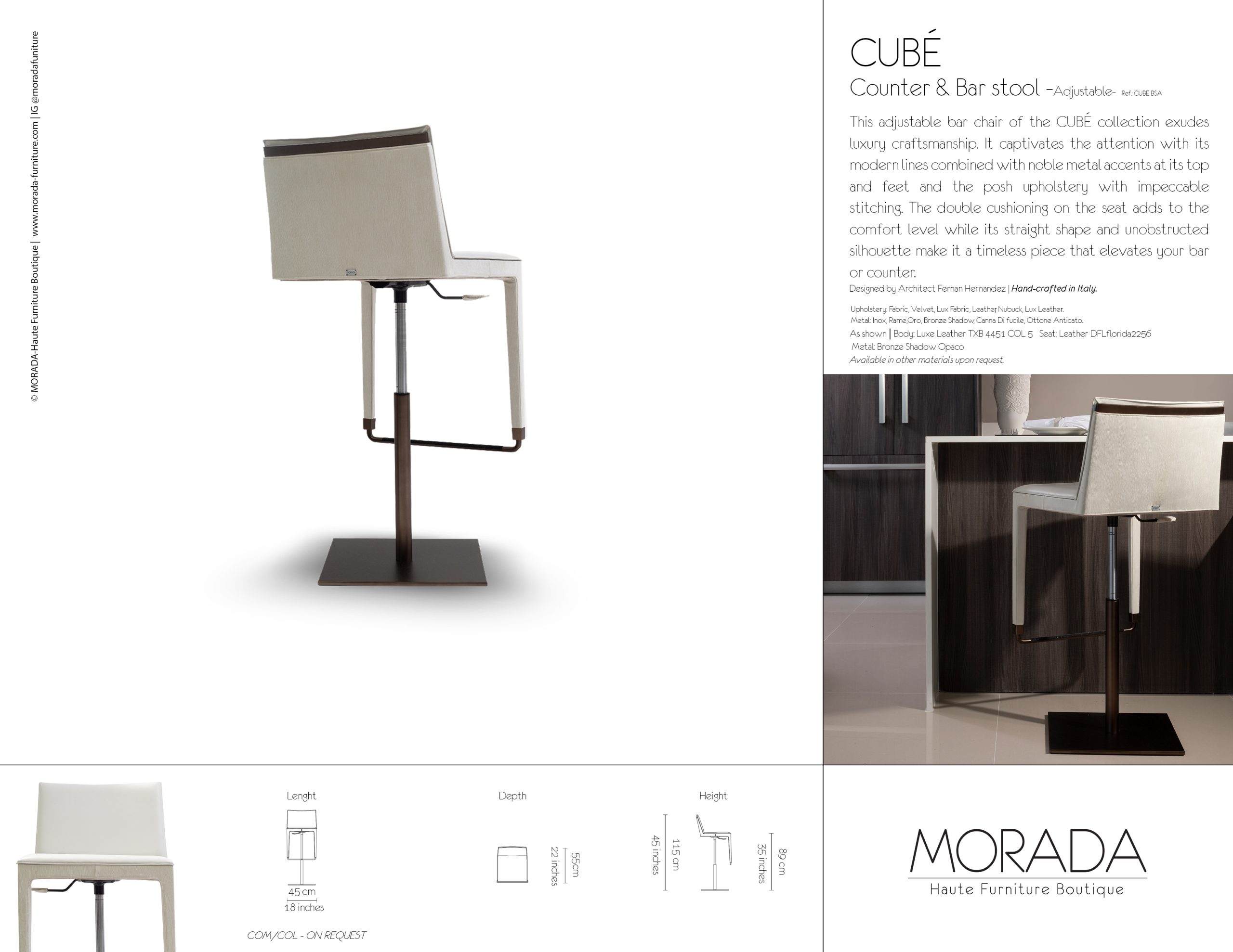 This adjustable bar chair of the CUBÉ collection exudes luxury craftsmanship. It captivates the attention with its modern lines combined with noble metal accents at its top and feet and the posh upholstery with impeccable stitching. The double cushioning on the seat adds to the comfort level while its straight shape and unobstructed silhouette make it a timeless piece that elevates your bar or counter.