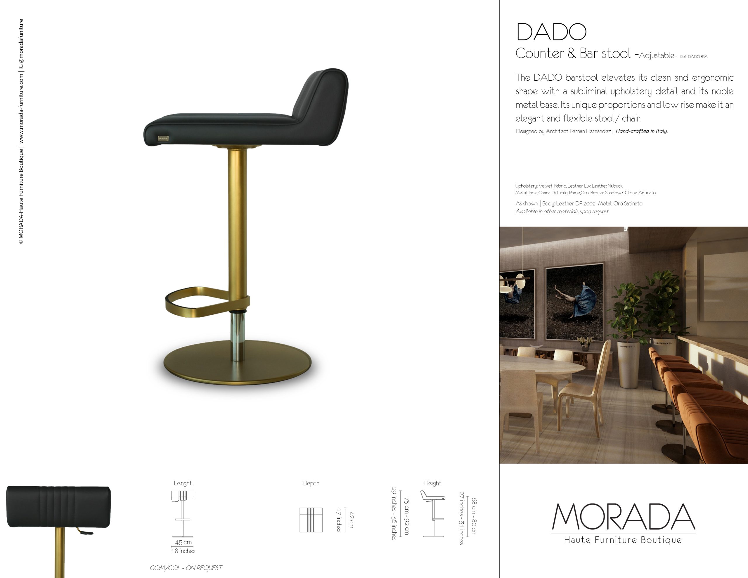 The DADO Bar Stool elevates its clean and ergonomic shape with a subliminal upholstery detail and its noble metal base. Its unique proportions and low rise make it an elegant and flexible stool/chair.