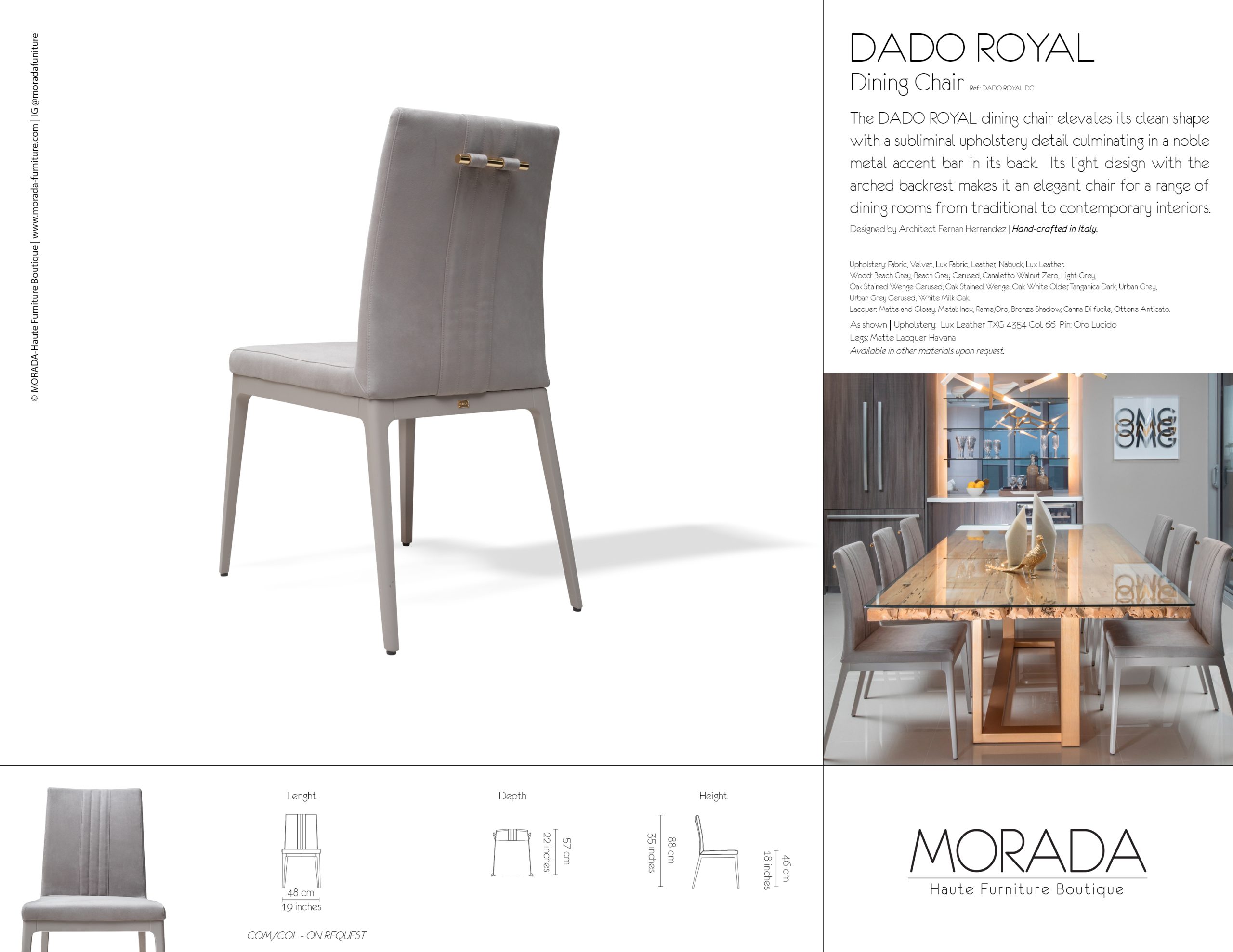 The DADO ROYAL dining chair elevates its clean shape with a subliminal upholstery detail culminating in a noble metal accent bar in its back. Its light design with the arched backrest makes it an elegant chair for a range of dining rooms from traditional to contemporary interiors.
