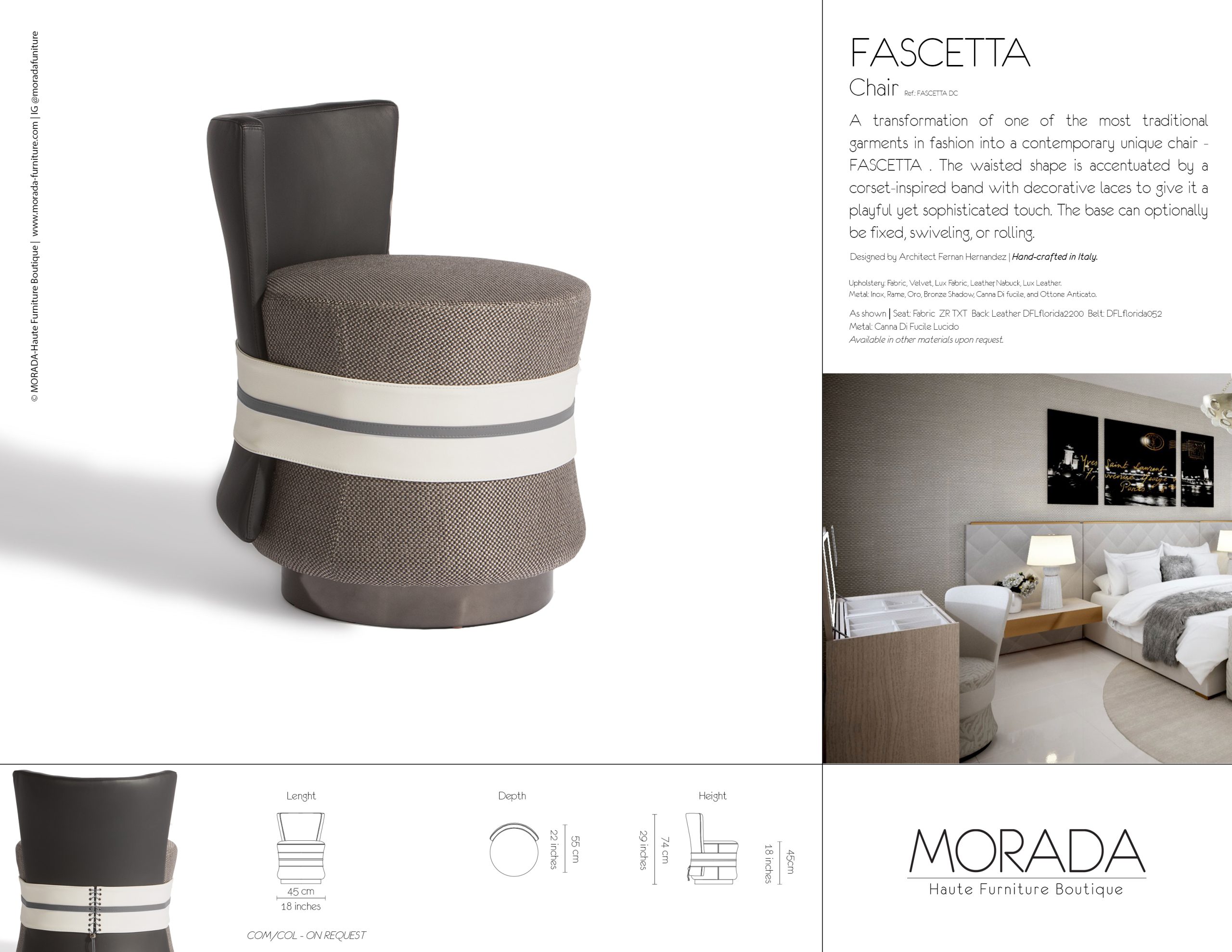 A transformation of one of the most traditional garments in fashion into a contemporary unique chair: FASCETTA. The waisted shape is accentuated by a corset-inspired band with decorative laces to give it a playful yet sophisticated touch. The base can optionally be fixed, swiveling, or rolling.