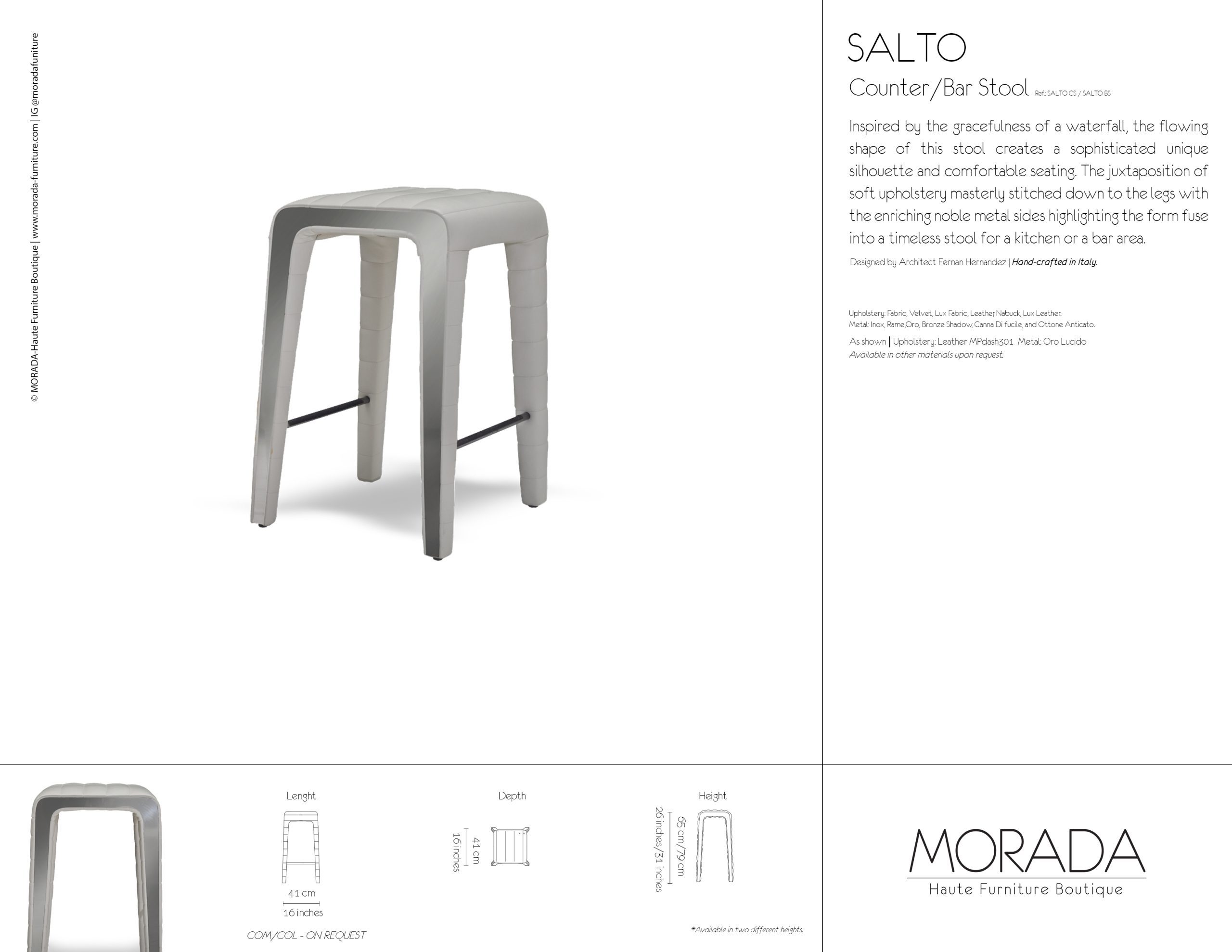 Inspired by the gracefulness of a waterfall, the flowing shape of this stool creates a sophisticated unique silhouette and comfortable seating. The juxtaposition of soft upholstery masterly stitched down to the legs with the enriching noble metal sides highlighting the form fuse into a timeless stool for a kitchen or a bar area.