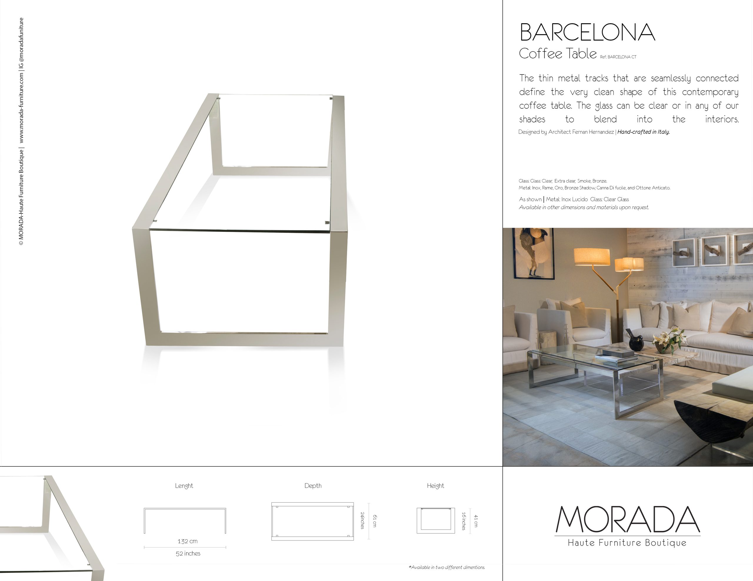 The thin metal tracks that are seamlessly connected define the very clean shape of this contemporary coffee table. The glass can be clear or in any of our shades to blend into the interiors.