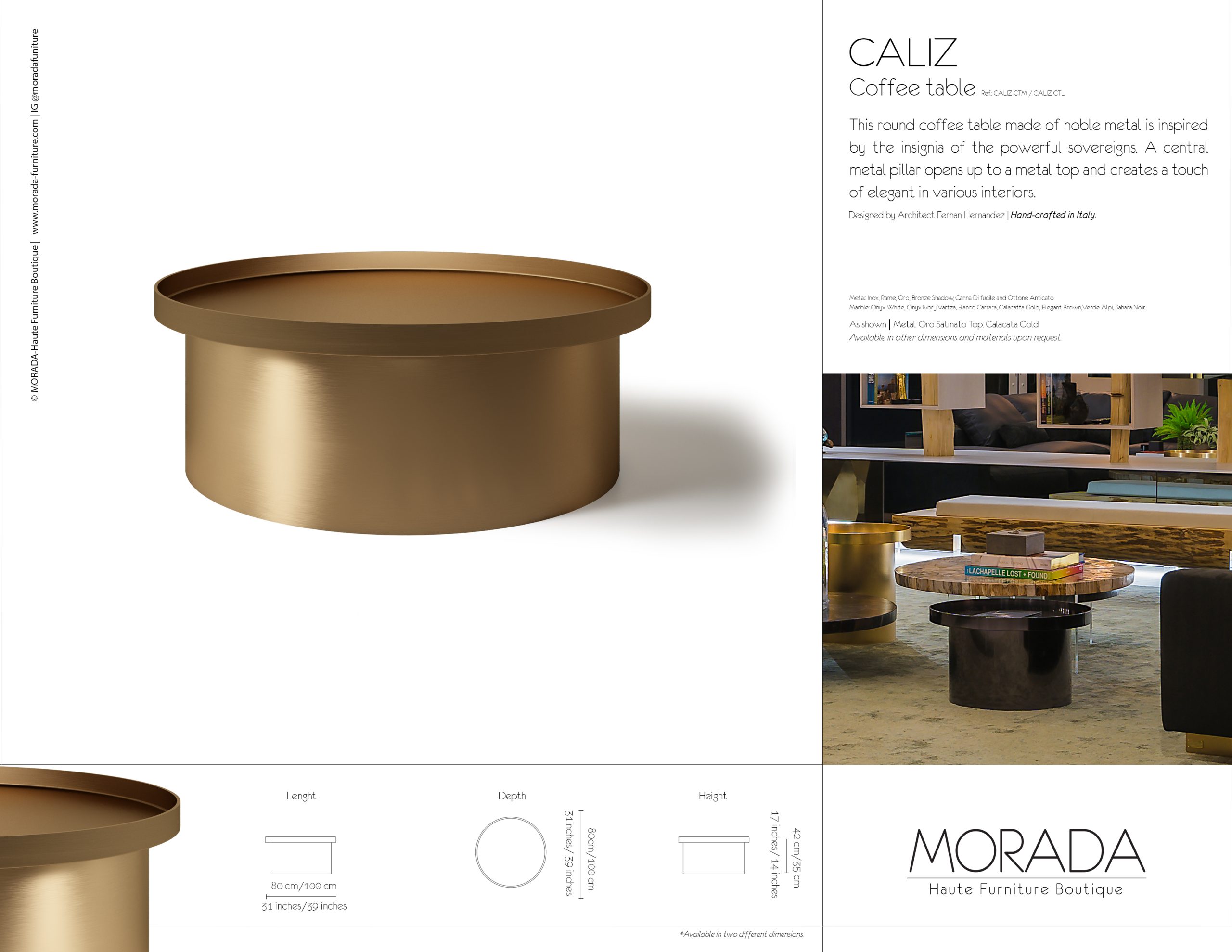 This round coffee table made of noble metal is inspired by the insignia of the powerful sovereigns. A central metal pillar opens up to a metal top and creates a touch of elegant in various interiors.