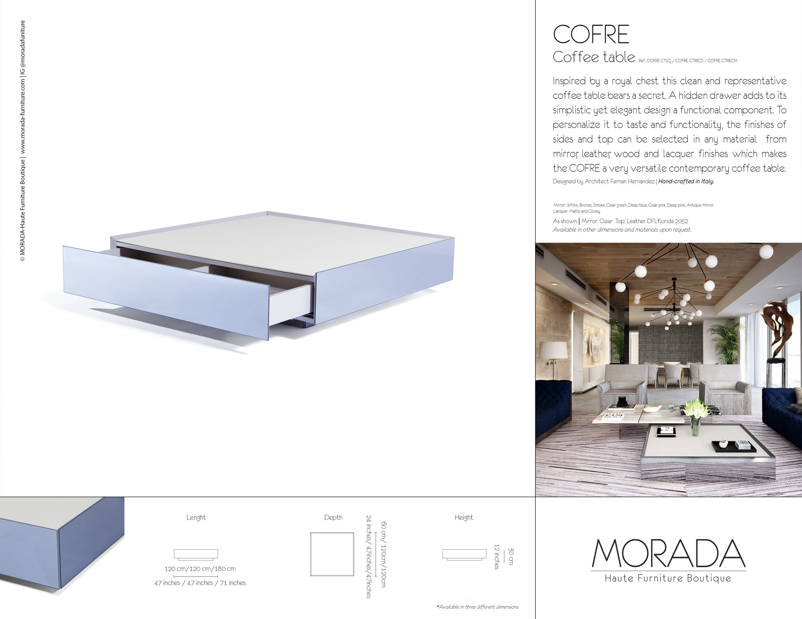 Inspired by a royal chest this clean and representative coffee table bears a secret. A hidden drawer adds to its simplistic yet elegant design a functional component. To personalize it to taste and functionality, the finishes of sides and top can be selected in any material from mirror, leather, wood and lacquer finishes which makes the COFRE a very versatile contemporary coffee table.