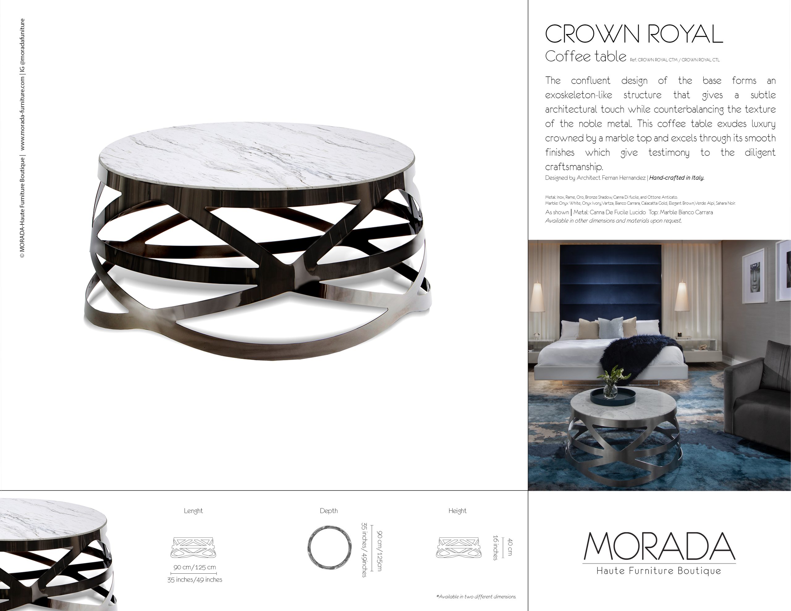 The confluent design of the base forms an exoskeleton-like structure that gives a subtle architectural touch while counterbalancing the texture of the noble metal. This coffee table exudes luxury crowned by a marble top and excels through its smooth finishes which give testimony to the diligent craftsmanship.