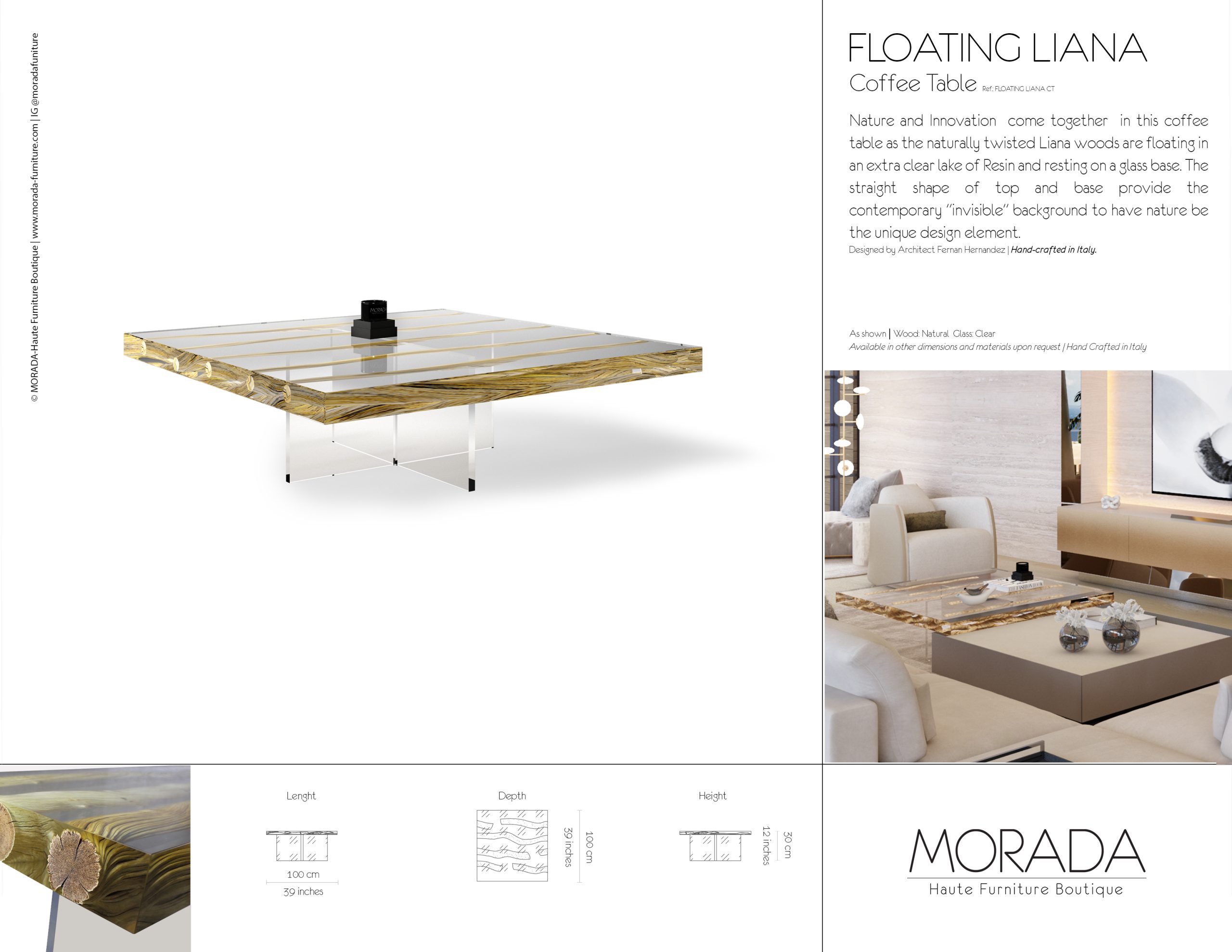 Nature and Innovation come together in this coffee table as the naturally twisted Liana woods are floating in an extra clear lake of Resin and resting on a glass base. The straight shape of top and base provide the contemporary invisible background to have nature be the unique design element.
