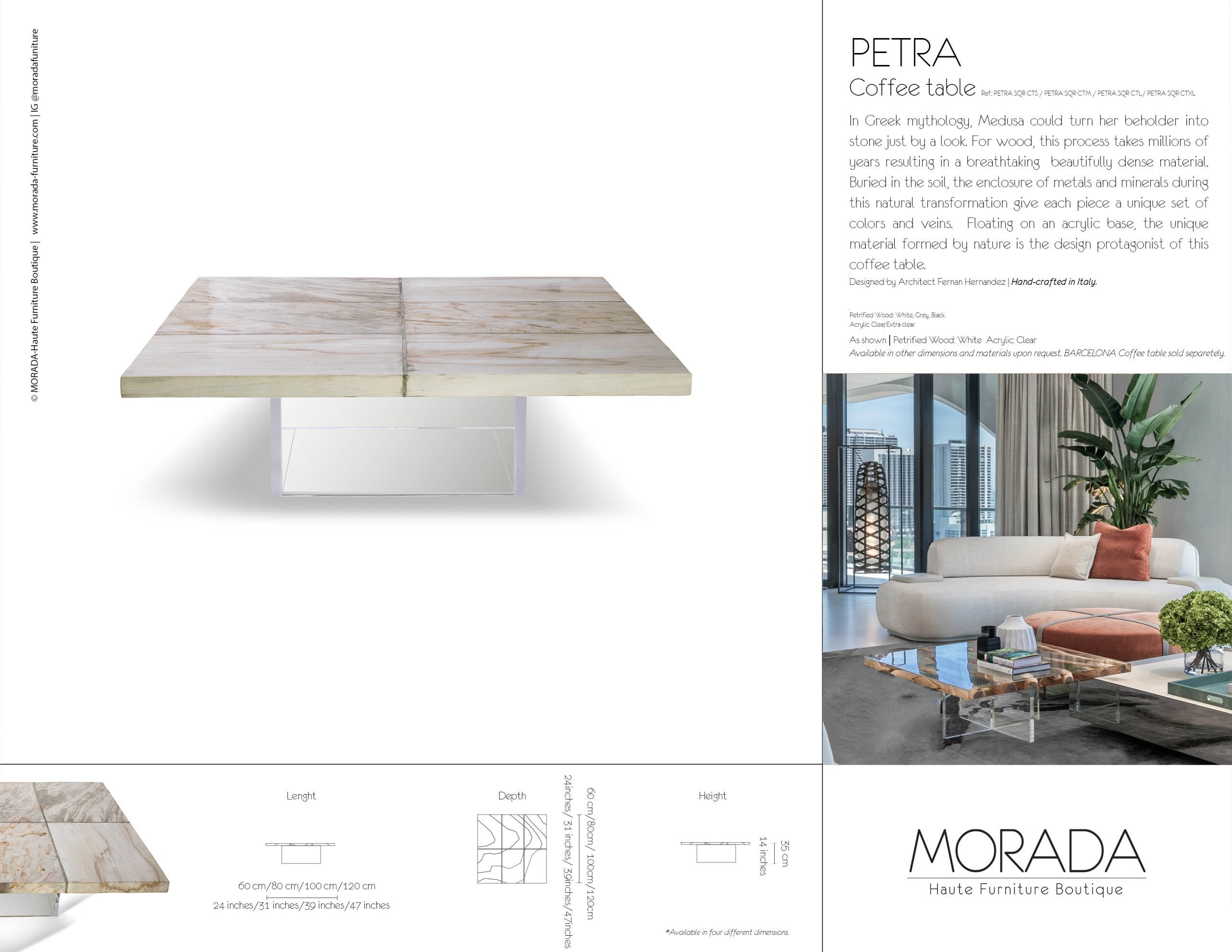 In Greek mythology, Medusa could turn her beholder into stone just by a look. For wood, this process takes millions of years resulting in a breathtaking beautifully dense material. Buried in the soil, the enclosure of metals and minerals during this natural transformation give each piece a unique set of colors and veins. Floating on an acrylic base, the unique material formed by nature is the design protagonist of this coffee table.