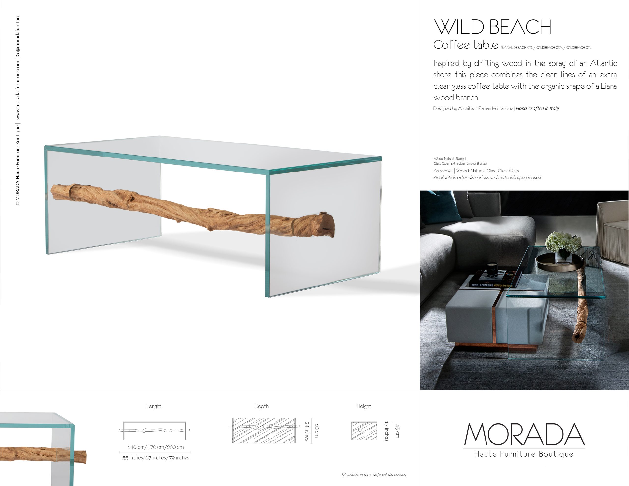 Inspired by drifting wood in the spray of an Atlantic shore this piece combines the clean lines of an extra clear glass coffee table with the organic shape of a Liana wood branch.