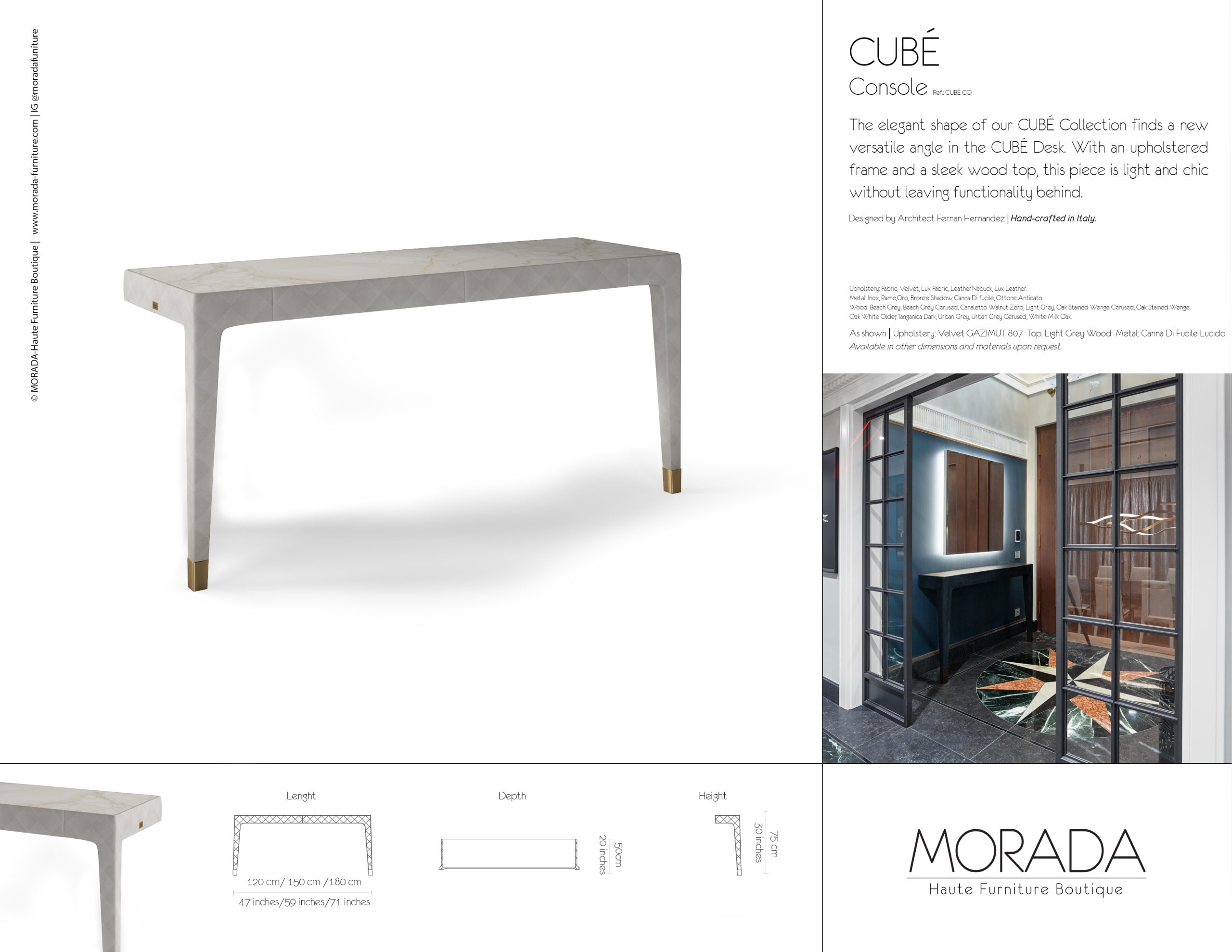 The elegant shape of our CUBÉ Collection finds a new versatile angle in the CUBÉ Desk. With an upholstered frame and a sleek wood top, this piece is light and chic without leaving functionality behind.