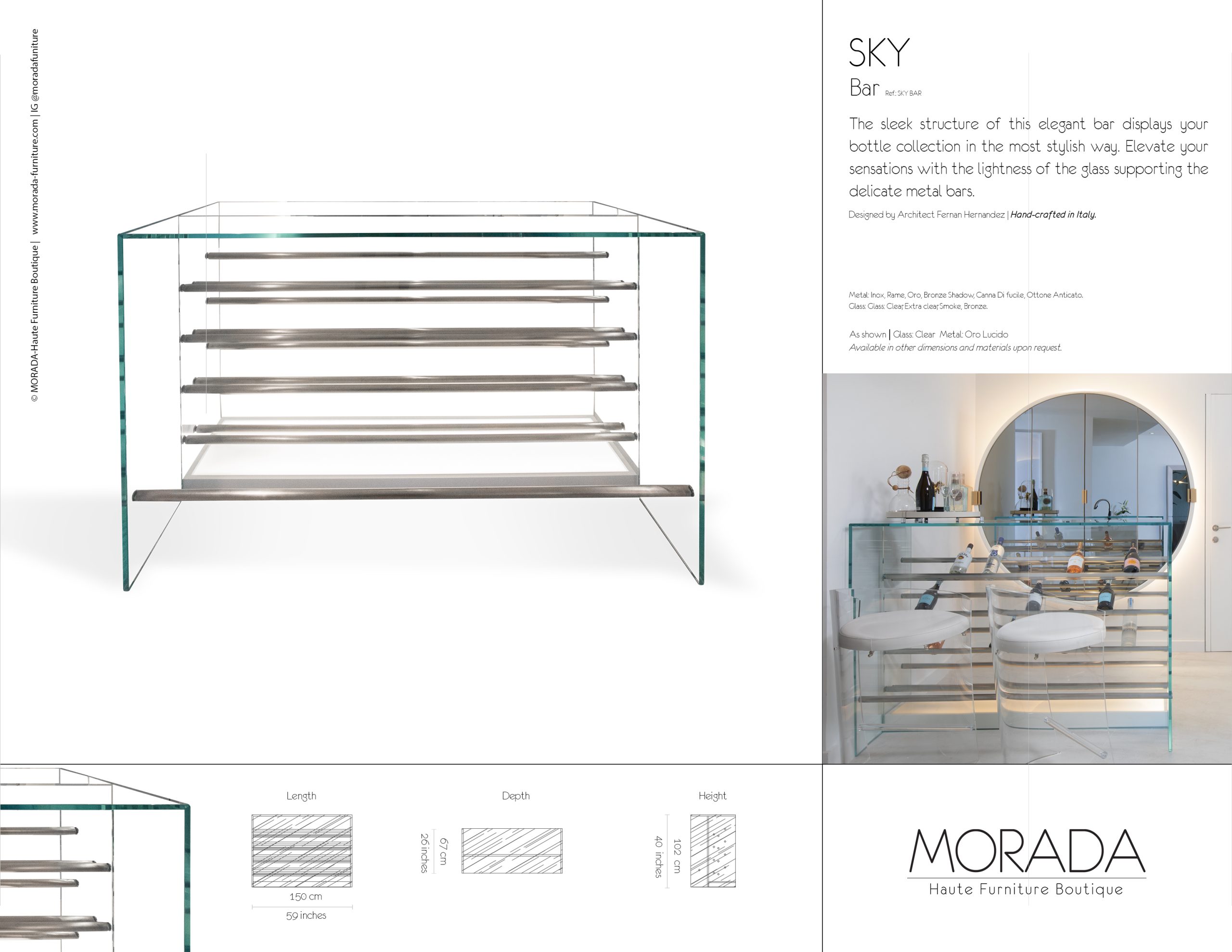 The sleek structure of this elegant bar displays your bottle collection in the most stylish way. Elevate your sensations with the lightness of the glass supporting the delicate metal bars.