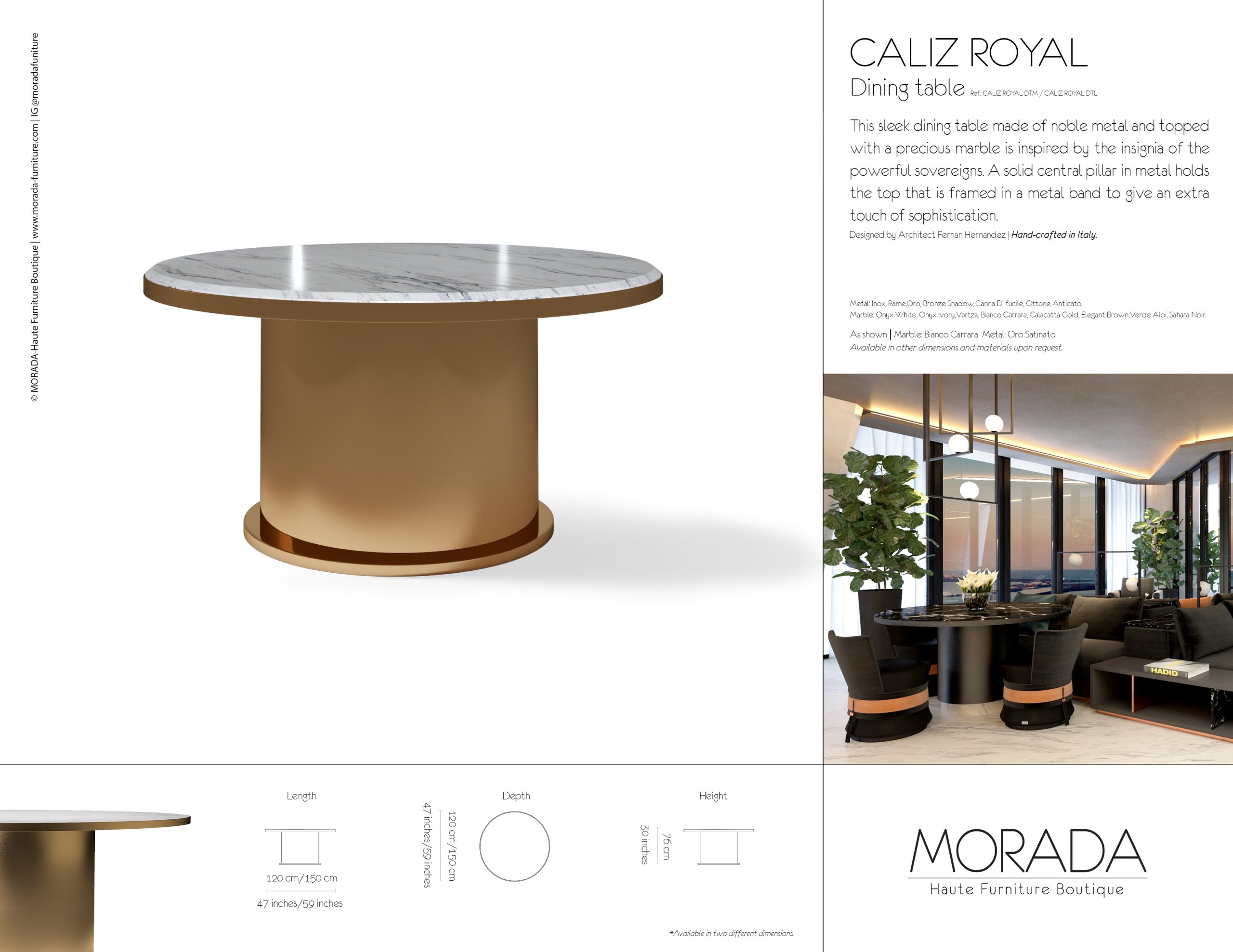 This sleek dining table made of noble metal and topped with a precious marble is inspired by the insignia of the powerful sovereigns. A solid central pillar in metal holds the top that is framed in a metal band to give an extra touch of sophistication.