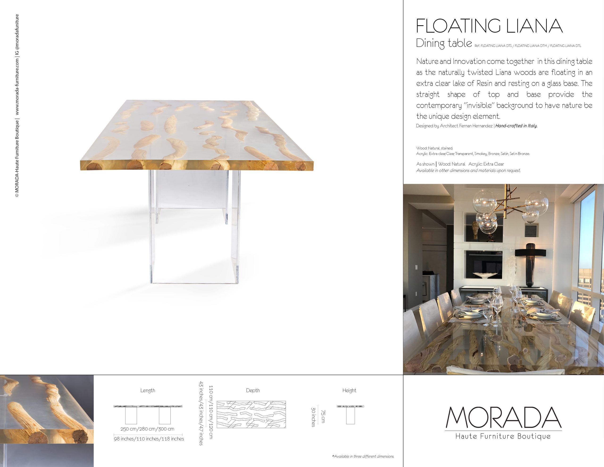 Nature and Innovation come together in this dining table as the naturally twisted Liana woods are floating in an extra clear lake of Resin and resting on a glass base. The straight shape of top and base provide the contemporary invisible background to have nature be the unique design element.