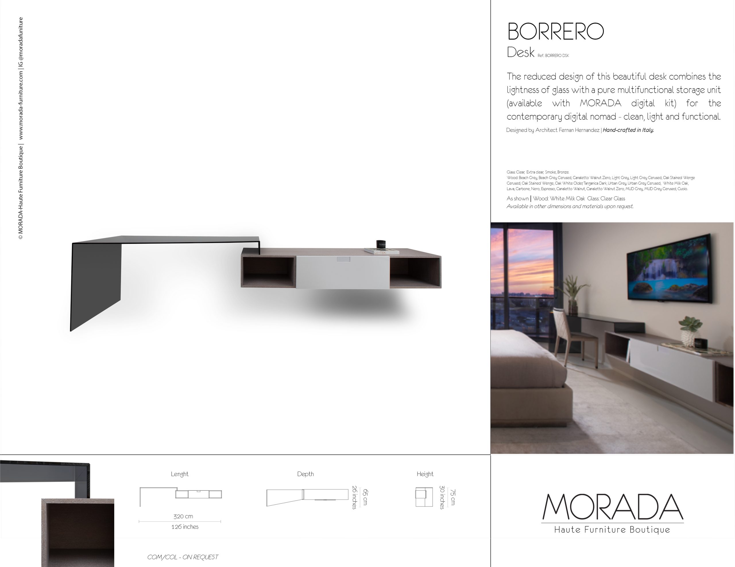 The reduced design of this beautiful desk combines the lightness of glass with a pure multifunctional storage unit (available with MORADA digital kit) for the contemporary digital nomad-clean, light and functional.