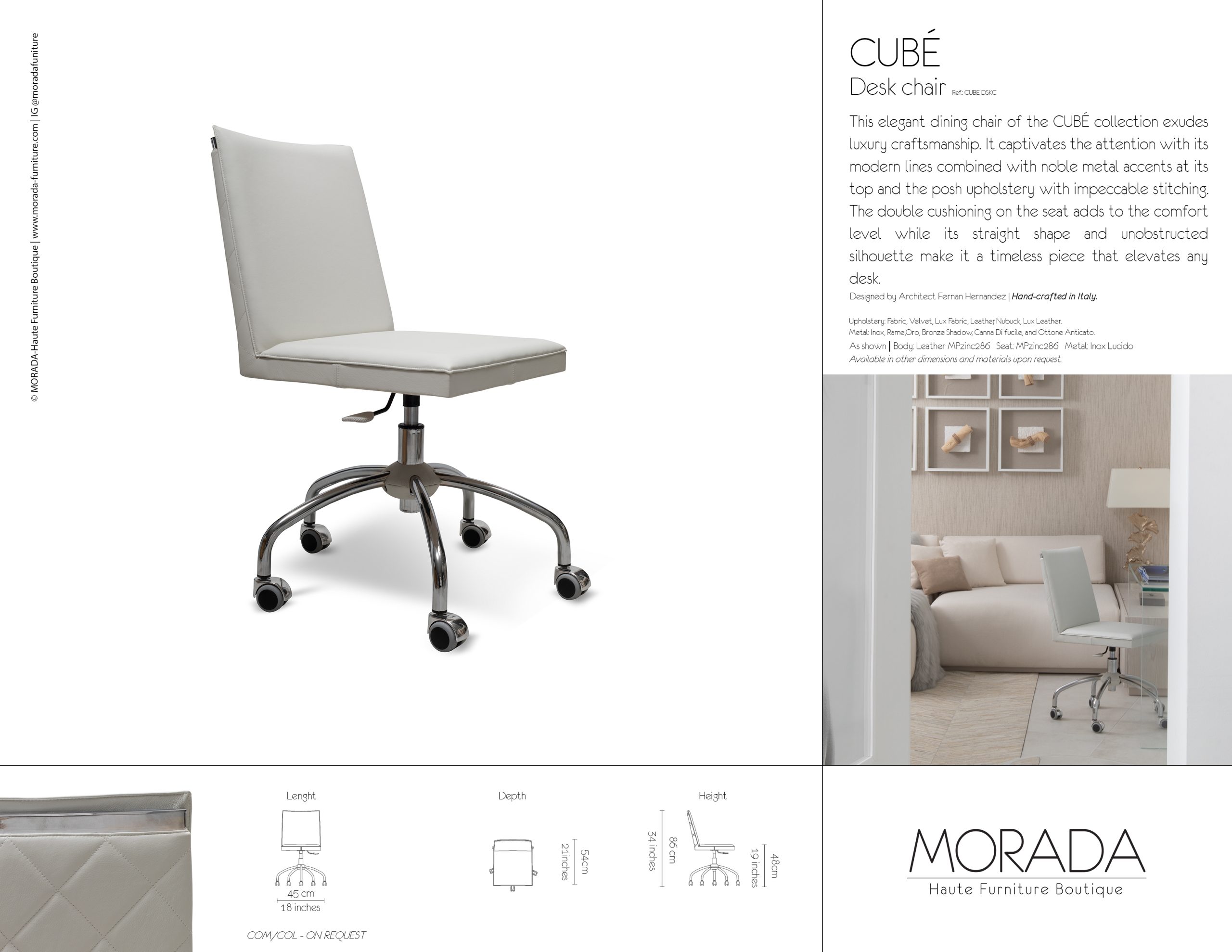 This elegant dining chair of the CUBÉ collection exudes luxury craftsmanship. It captivates the attention with its modern lines combined with noble metal accents at its top and the posh upholstery with impeccable stitching. The double cushioning on the seat adds to the comfort level while its straight shape and unobstructed silhouette make it a timeless piece that elevates any desk.