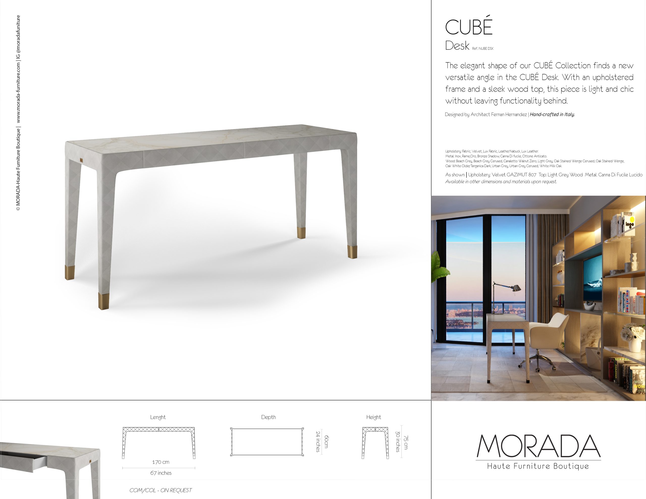 The elegant shape of our CUBÉ Collection finds a new versatile angle in the CUBÉ Desk. With an upholstered frame and a sleek wood top, this piece is light and chic without leaving functionality behind.
