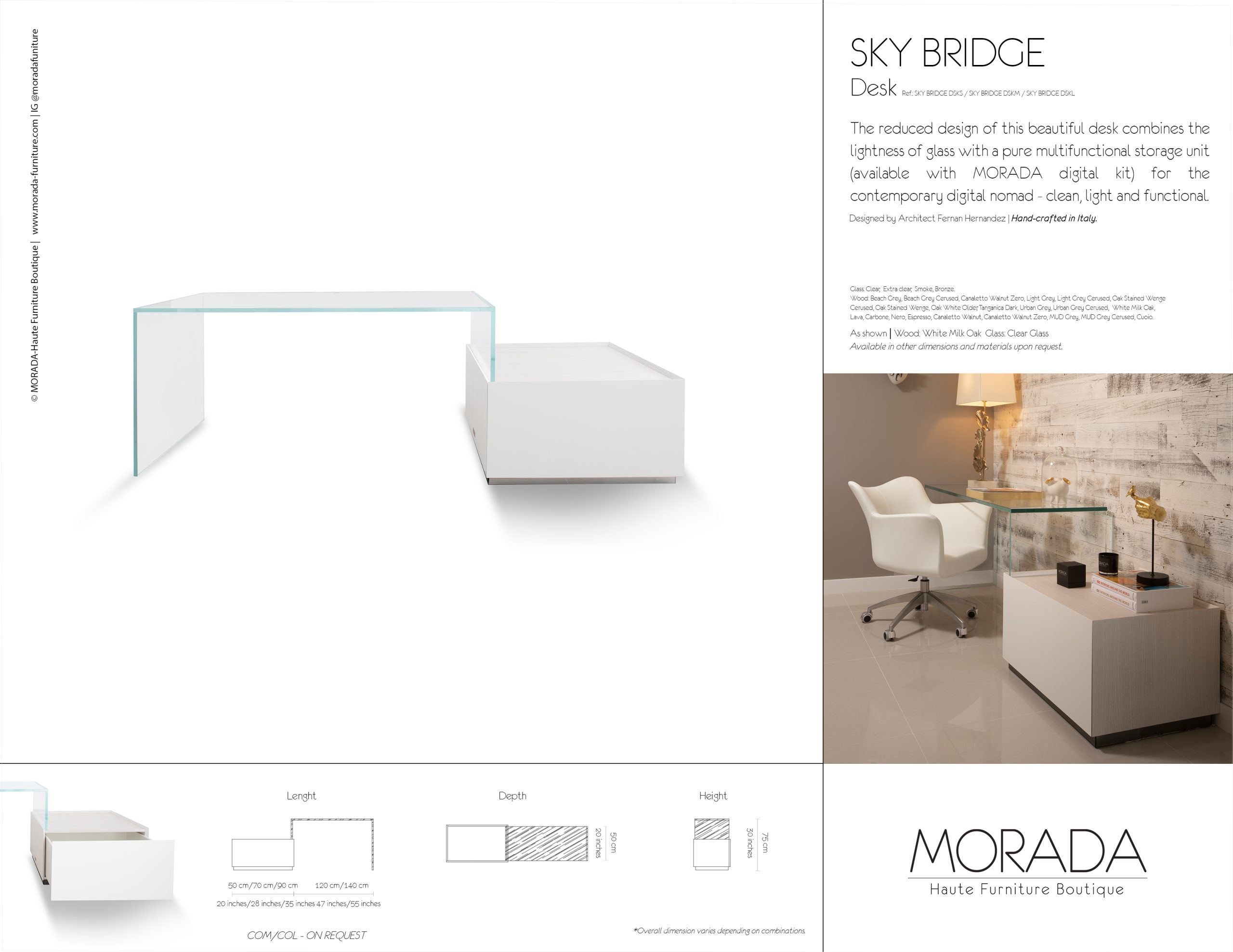 The reduced design of this beautiful desk combines the lightness of glass with a pure multifunctional storage unit (available with MORADA digital kit) for the contemporary digital nomad clean, light and functional.