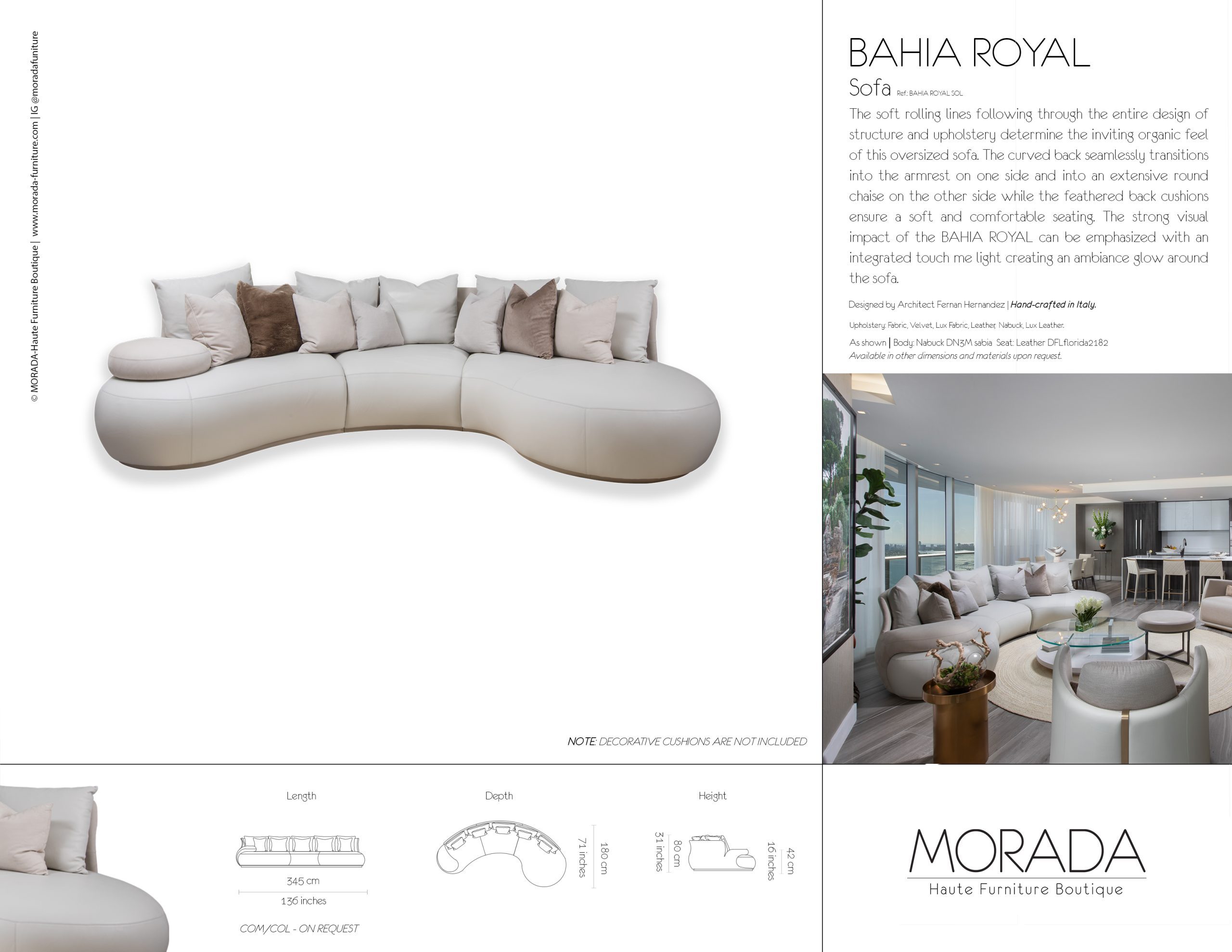 The soft rolling lines following through the entire design of structure and upholstery determine the inviting organic feel of this oversized sofa. The curved back seamlessly transitions into the armrest on one side and into an extensive round chaise on the other side while the feathered back cushions ensure a soft and comfortable seating. The strong visual impact of the BAHIA ROYAL can be emphasized with an integrated touch me light creating an ambiance glow around the sofa.