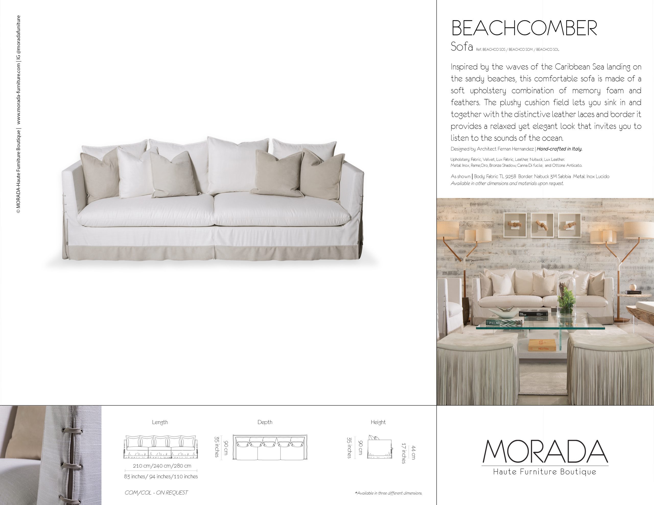 Inspired by the waves of the Caribbean Sea landing on the sandy beaches, this comfortable sofa is made of a soft upholstery combination of memory foam and feathers. The plushy cushion field lets you sink in and together with the distinctive leather laces and border it provides a relaxed yet elegant look that invites you to listen to the sounds of the ocean.