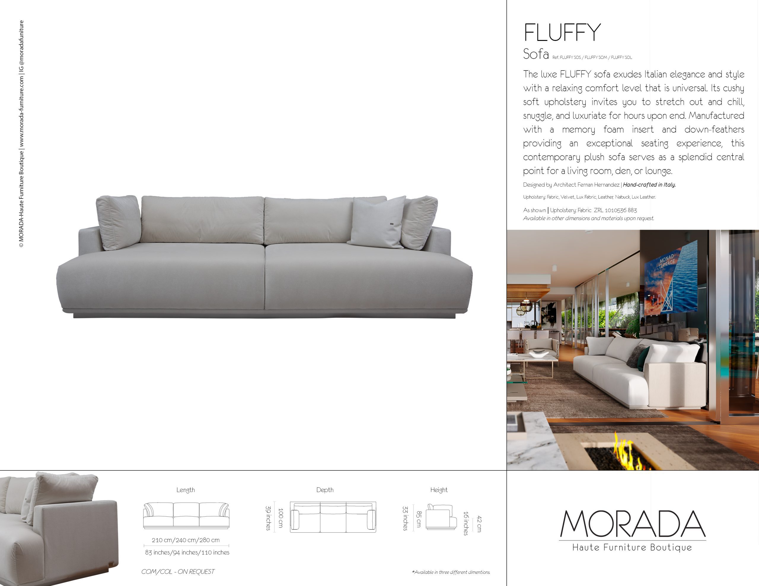 The luxe FLUFFY sofa exudes Italian elegance and style with a relaxing comfort level that is universal. Its cushy soft upholstery invites you to stretch out and chill, snuggle, and luxuriate for hours upon end. Manufactured with a memory foam insert and down-feathers providing an exceptional seating experience, this contemporary plush sofa serves as a splendid central point for a living room, den, or lounge.