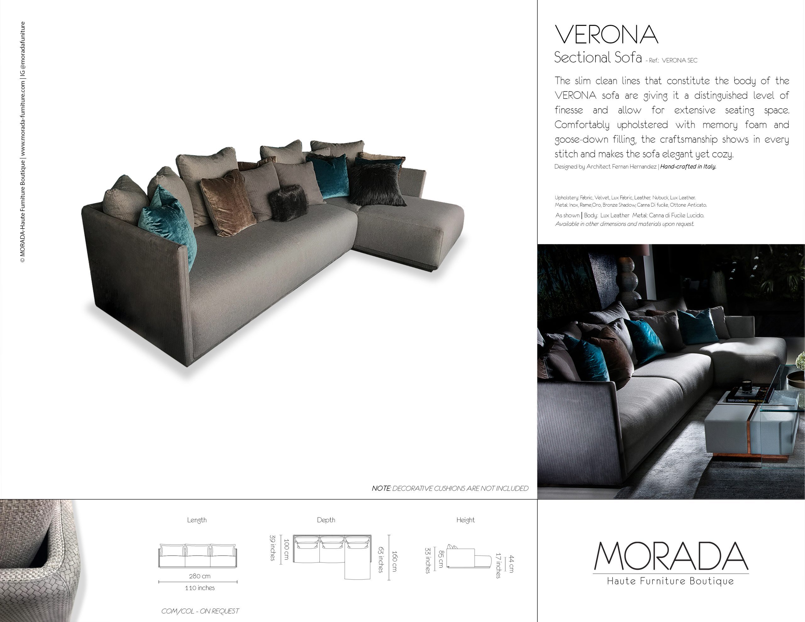 The slim clean lines that constitute the body of the VERONA sofa are giving it a distinguished level of finesse and allow for extensive seating space. Comfortably upholstered with memory foam and goose-down filling, the craftsmanship shows in every stitch and makes the sofa elegant yet cozy.