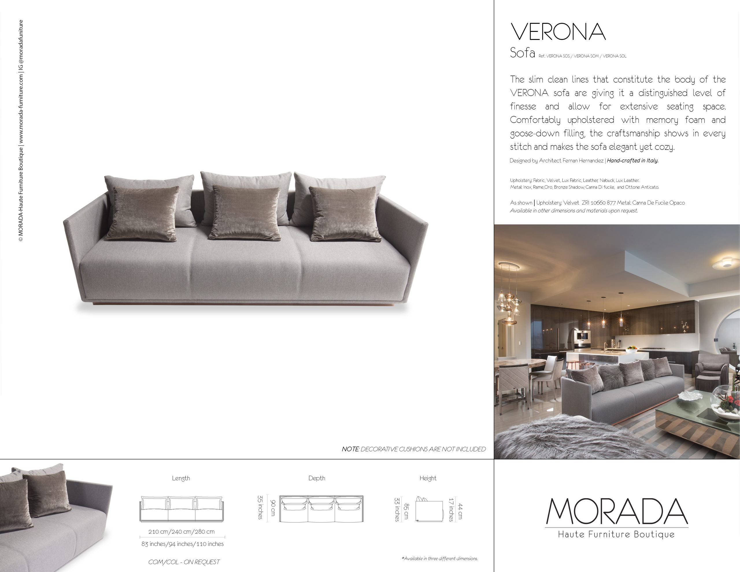 The slim clean lines that constitute the body of the VERONA sofa are giving it a distinguished level of finesse and allow for extensive seating space. Comfortably upholstered with memory foam and goose-down filling, the craftsmanship shows in every stitch and makes the sofa elegant yet cozy.