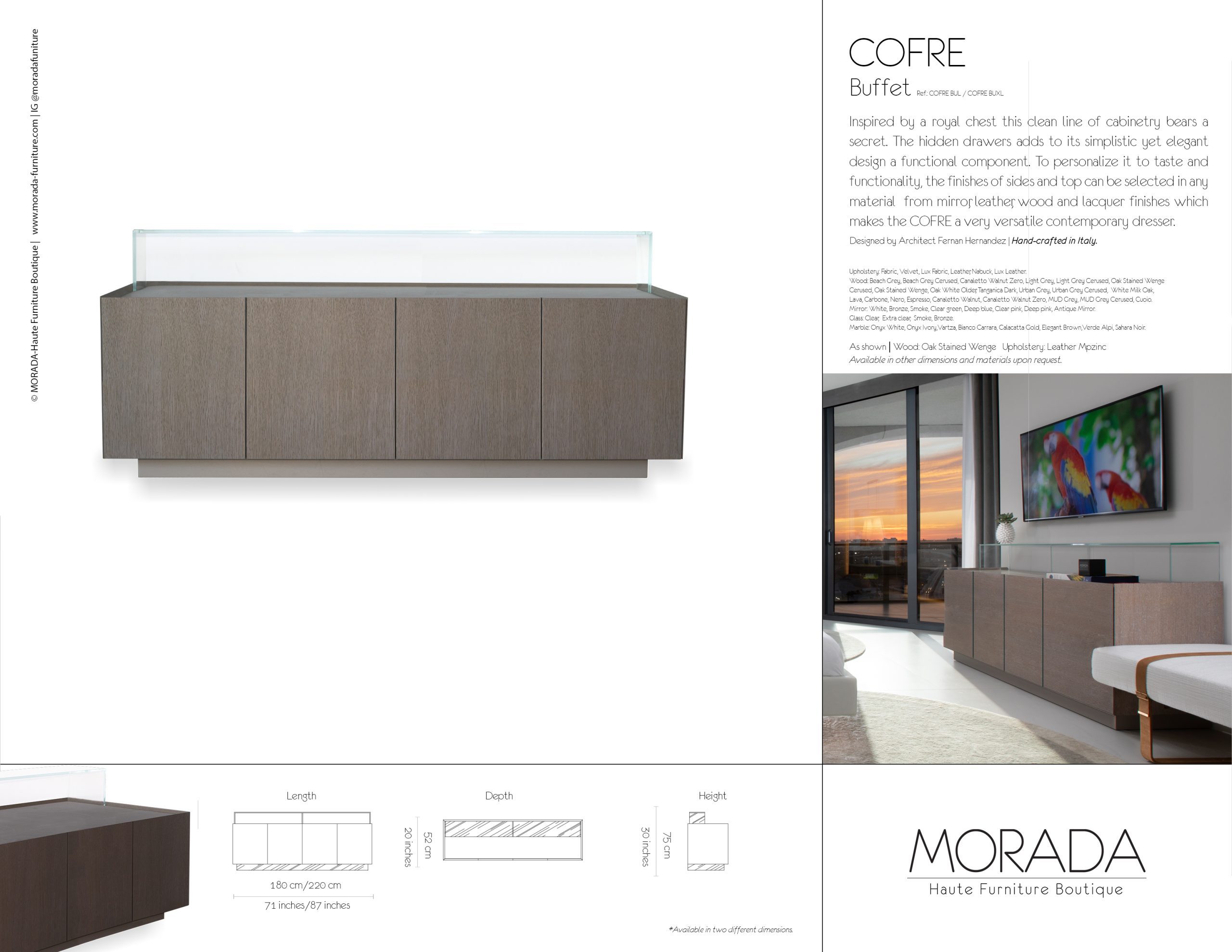 Inspired by a royal chest this clean line of cabinetry bears a secret. The hidden drawers adds to its simplistic yet elegant design a functional component. To personalize it to taste and functionality, the finishes of sides and top can be selected in any material from mirror, leather, wood and lacquer finishes which makes the COFRE a very versatile contemporary buffet.