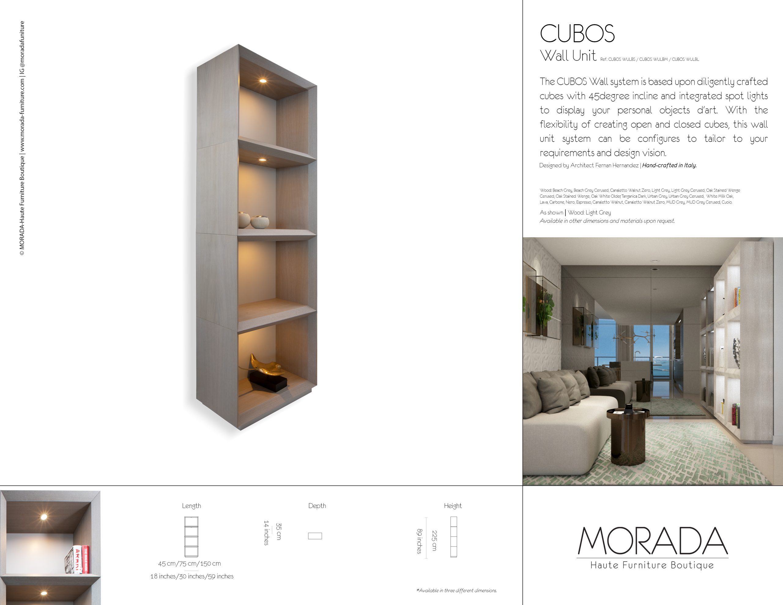 The CUBOS Wall system is based upon diligently crafted cubes with 45 degree incline and integrated spot lights to display your personal objects. With the flexibility of creating open and closed cubes, this wall unit system can be configures to tailor to your requirements and design vision.