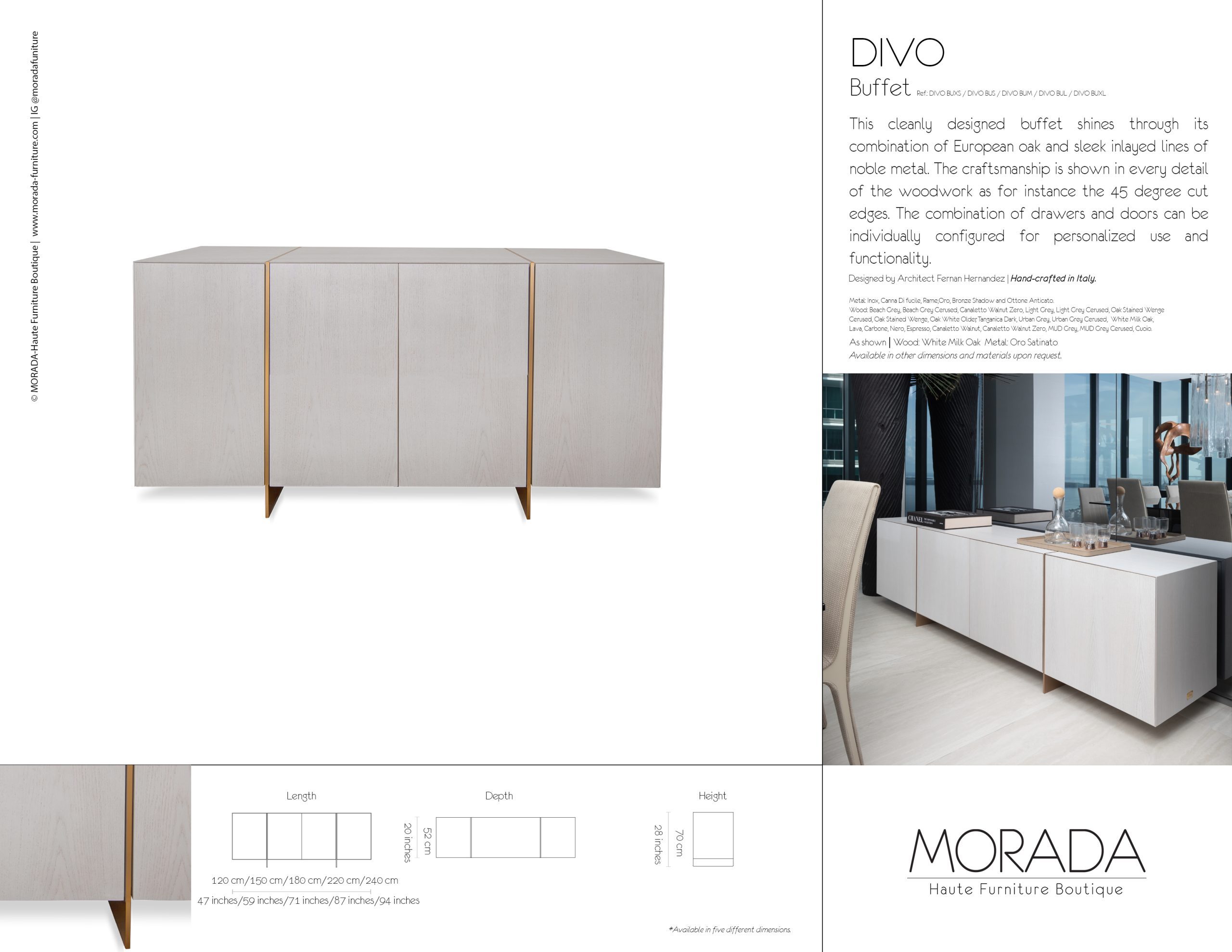 This cleanly designed buffet shines through its combination of European oak and sleek inlayed lines of noble metal. The craftsmanship is shown in every detail of the woodwork as for instance the 45 degree cut edges.The interior distribution accomodates for silverware dravers and porcelaine shelves whitle the exterior doors keep the clean sophisticated look.