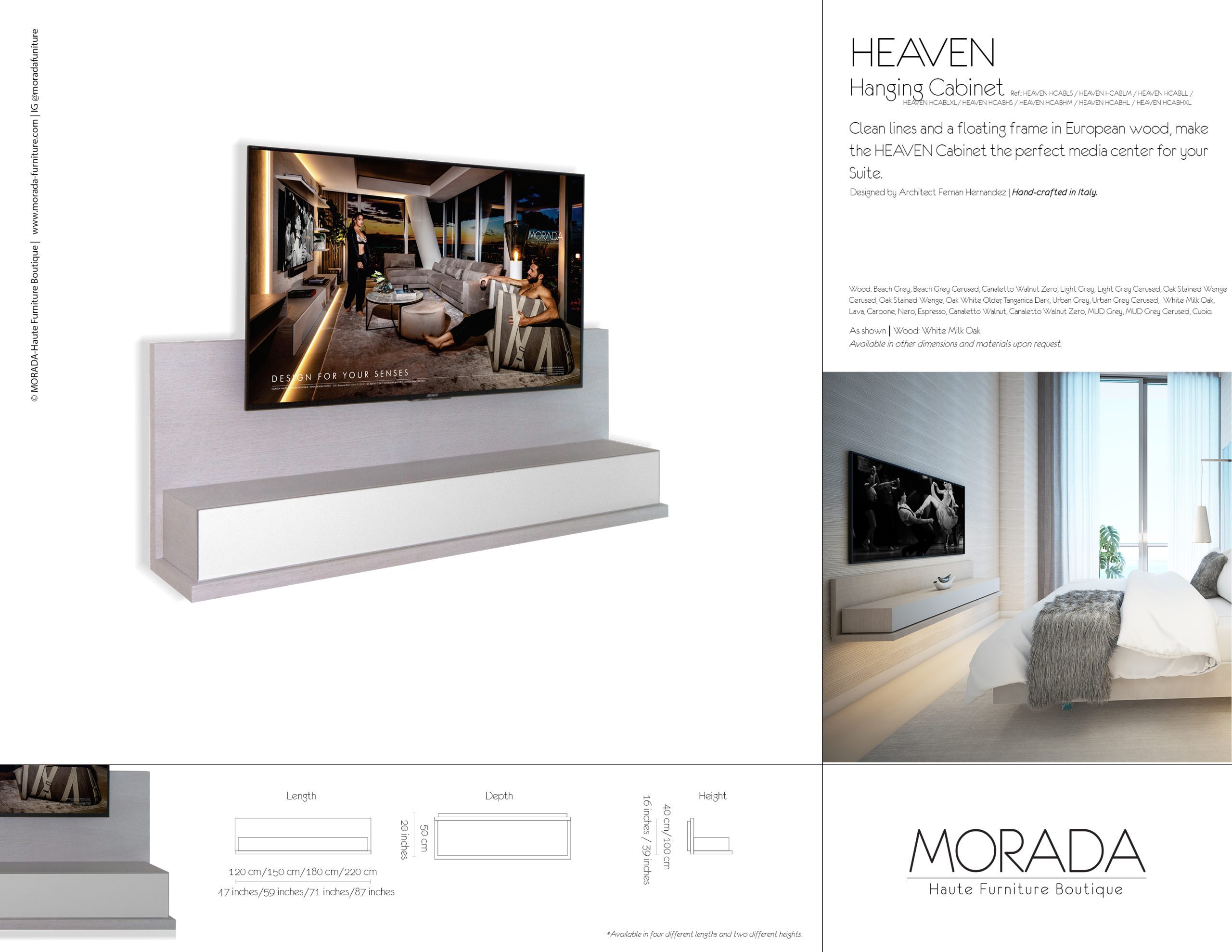 Clean lines and a floating frame in European wood, make the HEAVEN Cabinet the perfect media center for your Suite.