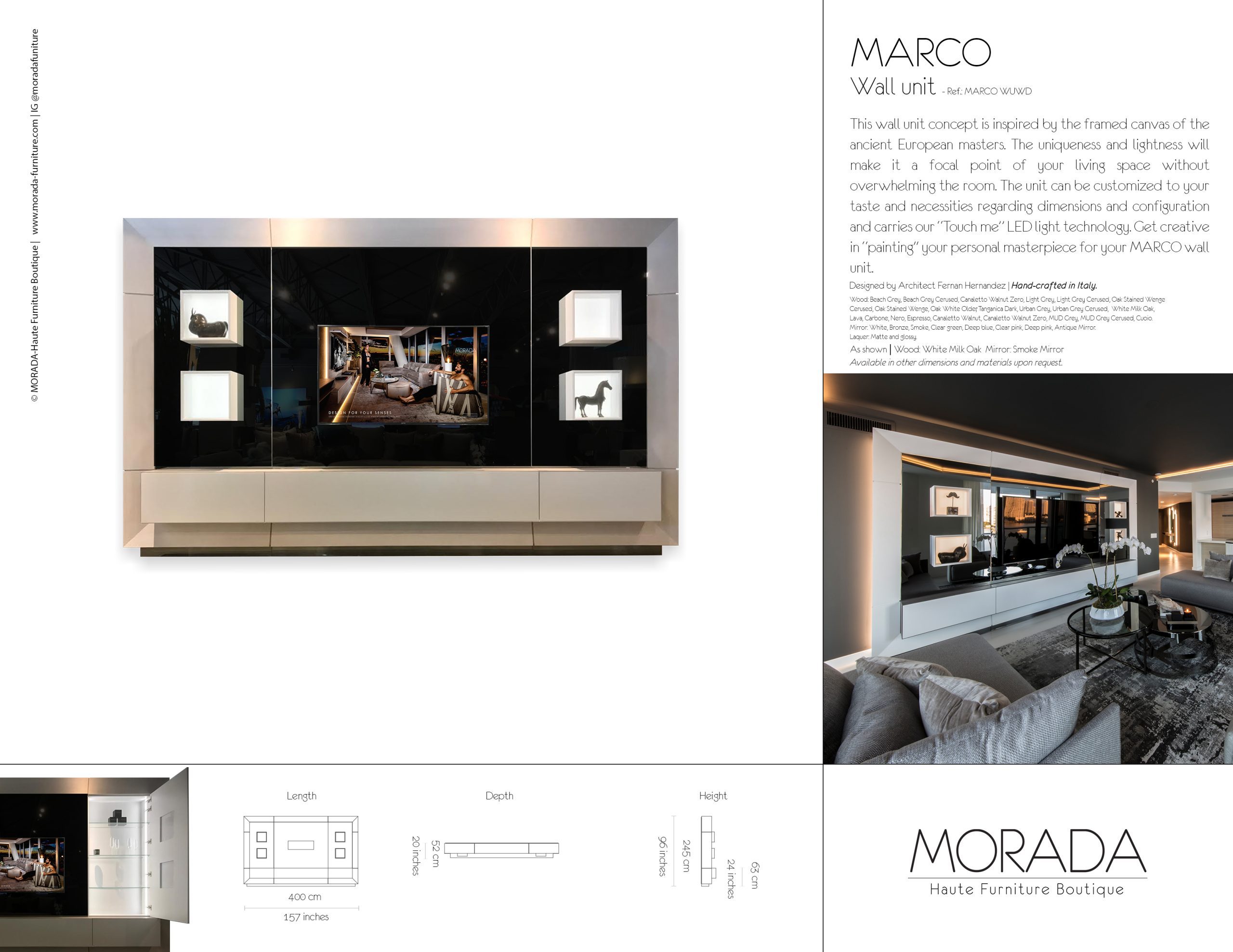 This wall unit concept is inspired by the framed canvas of the ancient European masters. The uniqueness and lightness will make it a focal point of your living space without overwhelming the room. The unit can be customized to your taste and necessities regarding dimensions and configuration and carries our ‘Touch me’ LED light technology. Get creative in painting your personal masterpiece for your MARCO wall unit.